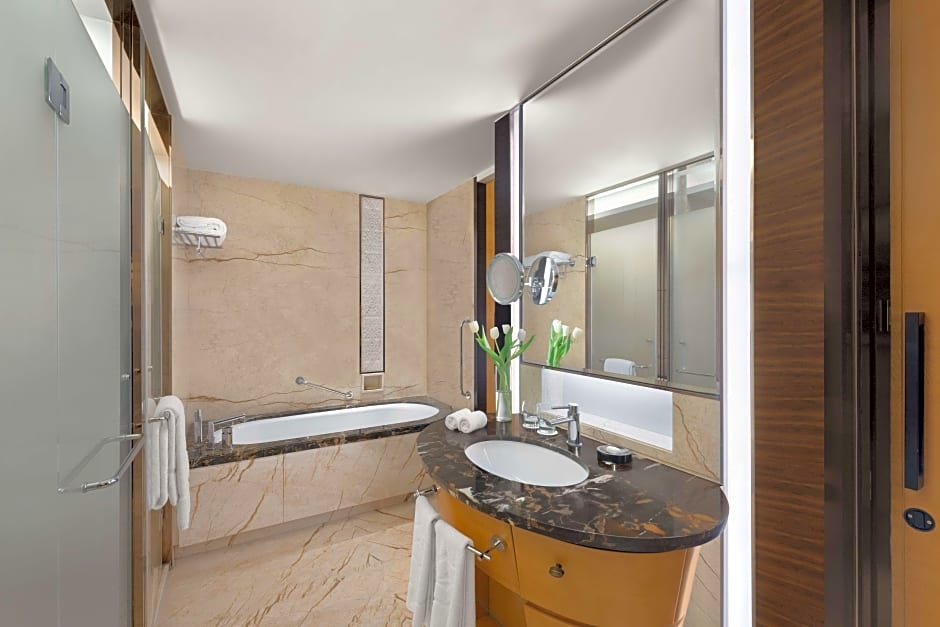 This room provides views of the city. Signature Shangri-La bed, with 300 thread-count Frette linen, and climate control to complement the building’s integrated sun-shielding. Large marble-clad bathroom with walk-in shower.